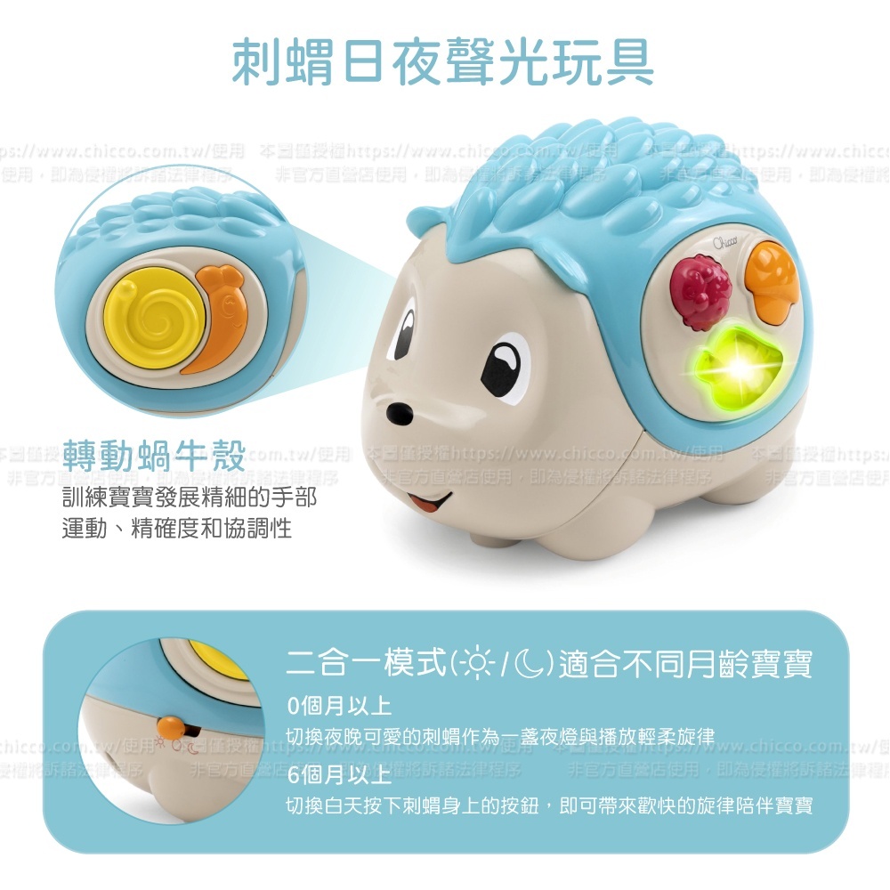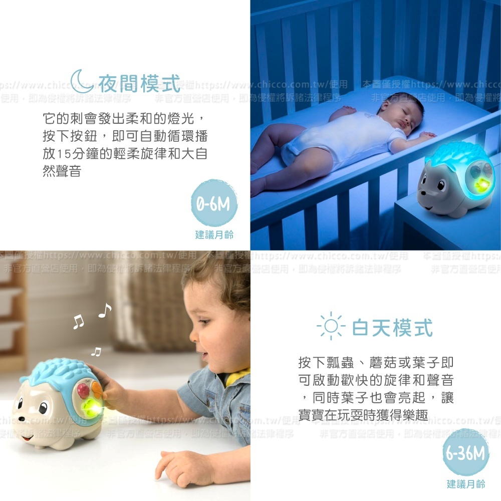 ●0個月以上:可愛的刺蝟作為一盞夜燈。在夜間模式下,它的刺會發出柔和的燈光,按下按鈕,即可自動循環播放15分鐘的輕柔旋律和大自然聲音