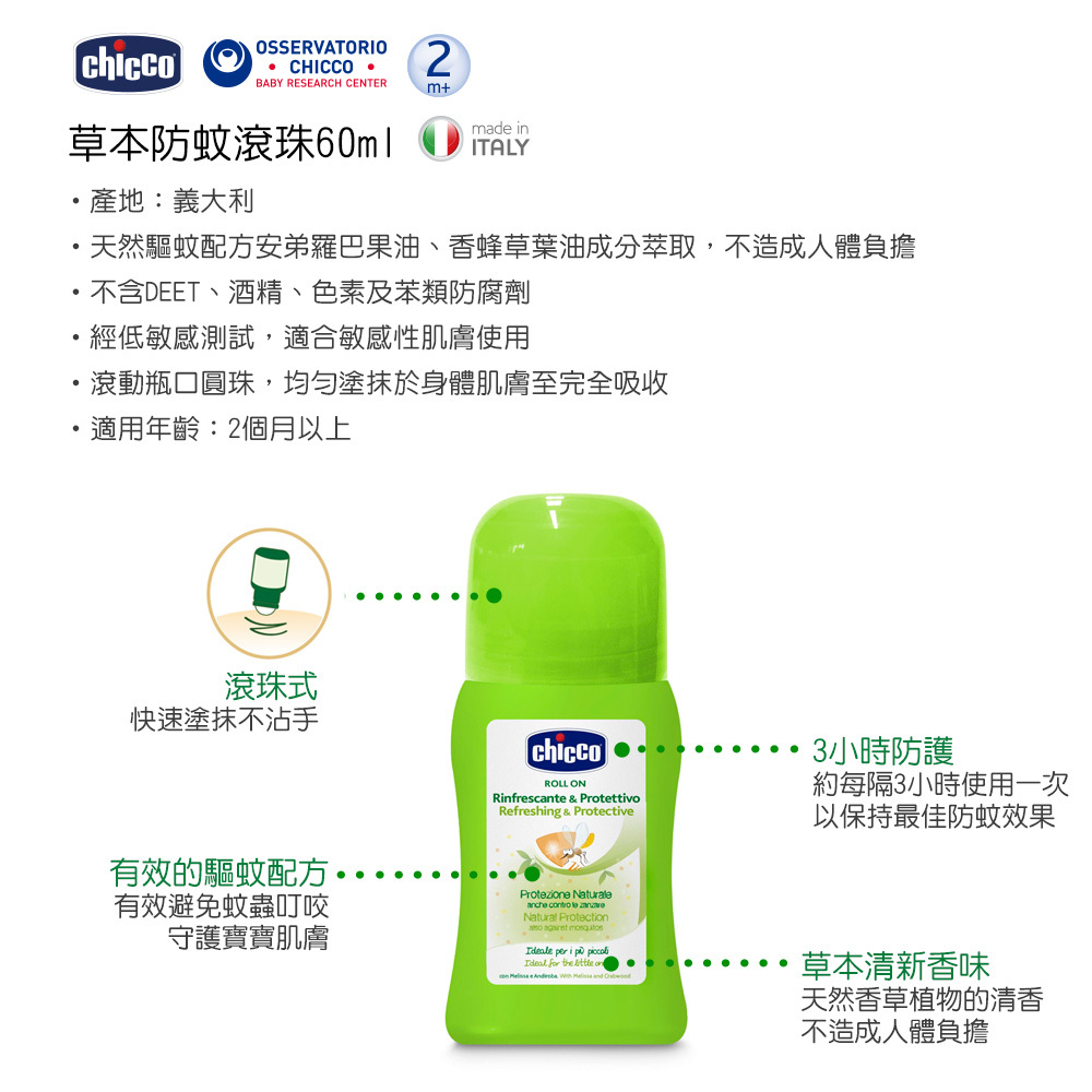 使用方法:滾動瓶口圓珠,均勻塗抹於身體肌膚至完全吸收;約每隔3小時使用一次,以保持最佳防蚊效果。
