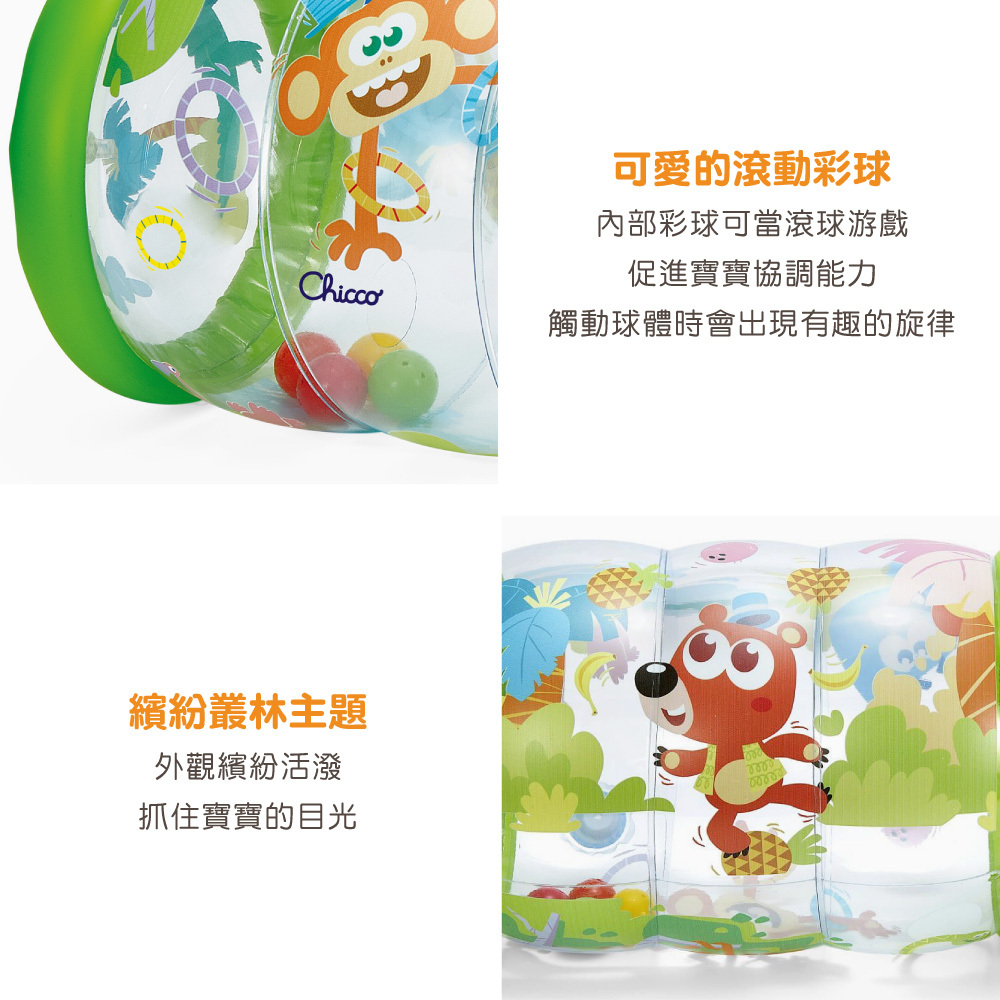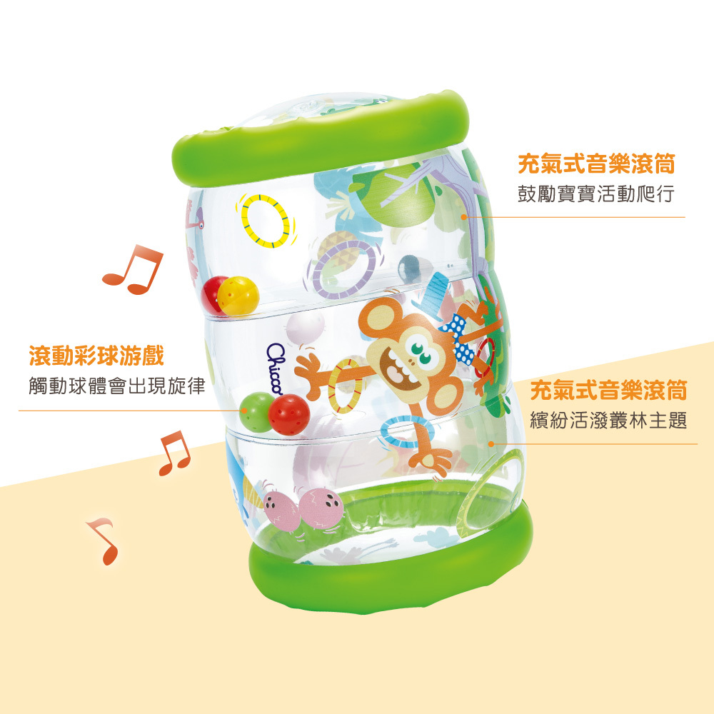●充氣式音樂滾筒,有三顆彩球可當滾球游戲,促進寶寶協調能力