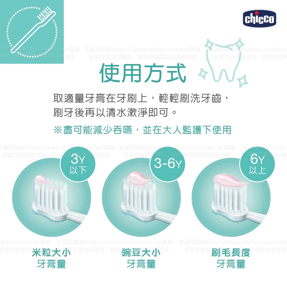 2.三歲以下幼童,請使用「米粒」大小的牙膏量;三至六歲的幼童,請使用一顆「豌豆」(0.25公克至0.5公克)的牙膏量。