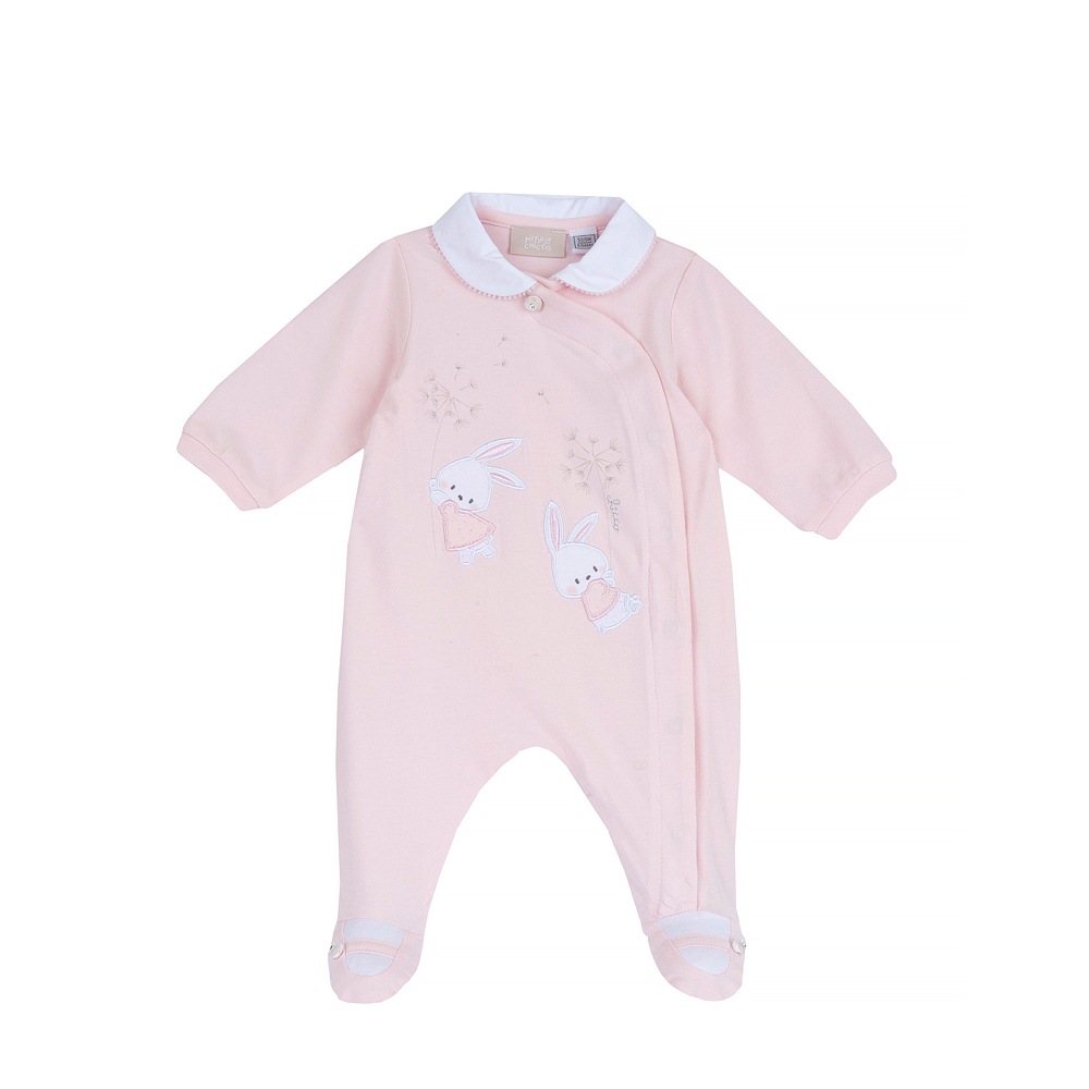 內容物:小兔花園-繡圖有領前側開長袖兔裝62公分+小兔花園-短袖連身衣二入68公分+小兔花園-立體蝴蝶結嬰兒帽尺寸40