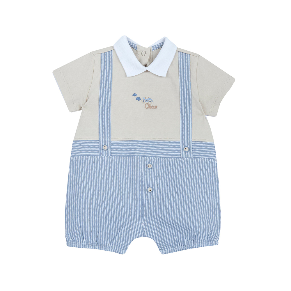 內容物: 車車王國-假吊帶剪接條紋有領短袖兔裝 68公分+ 粉彩-前側開短袖連身衣二入 68公分+車車王國-滿版印花反折嬰兒帽 尺寸44