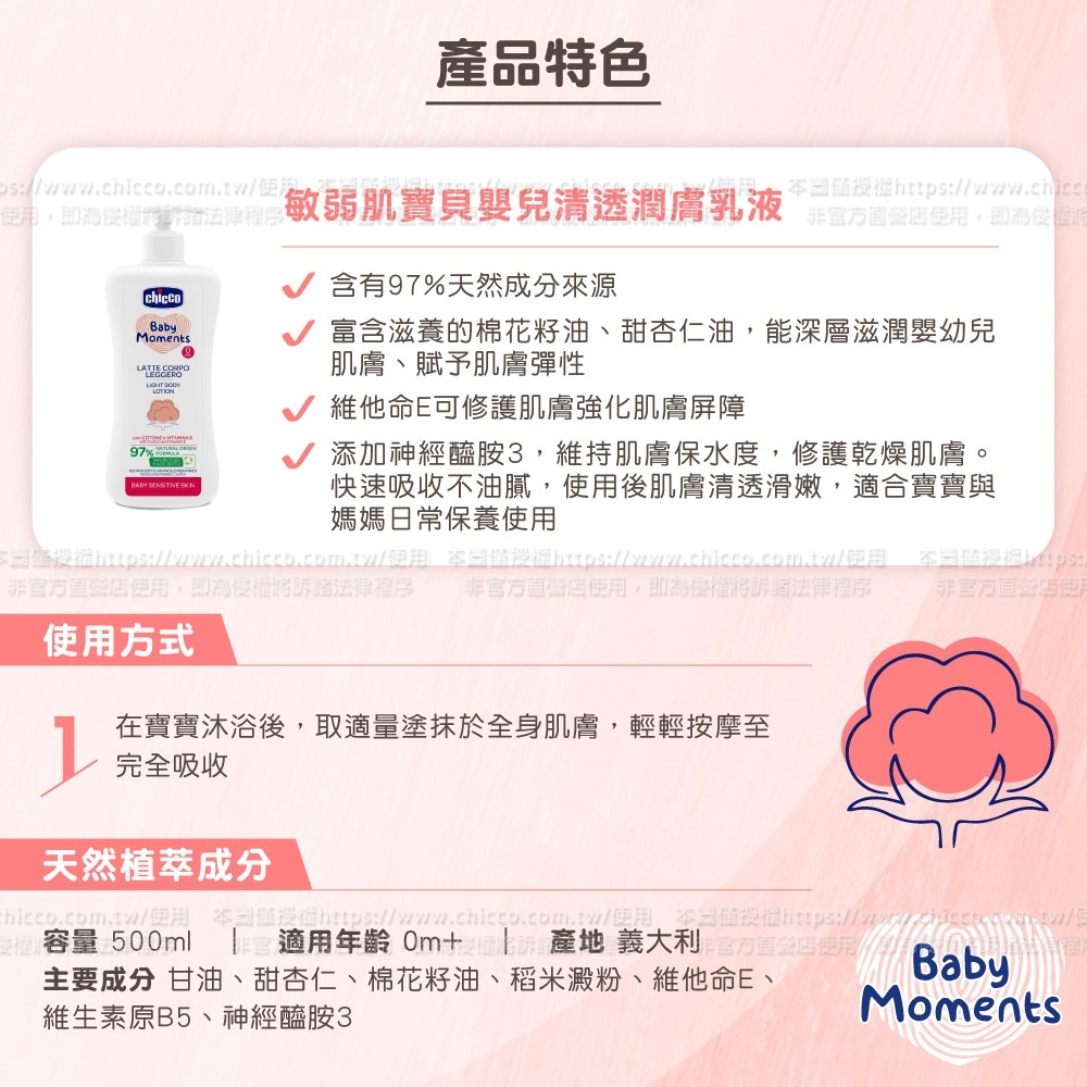 ●富含滋養的棉花籽油、甜杏仁油,深層滋潤嬰幼兒肌膚、賦予肌膚彈性,