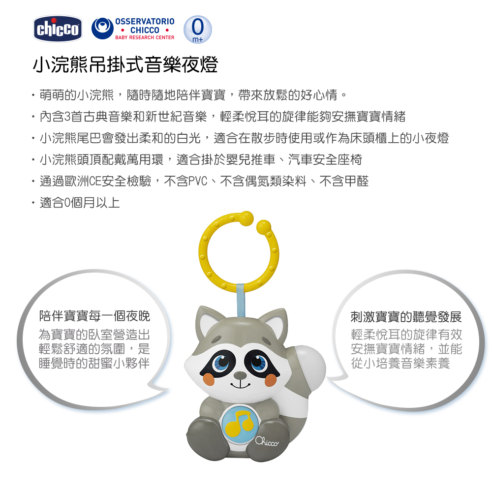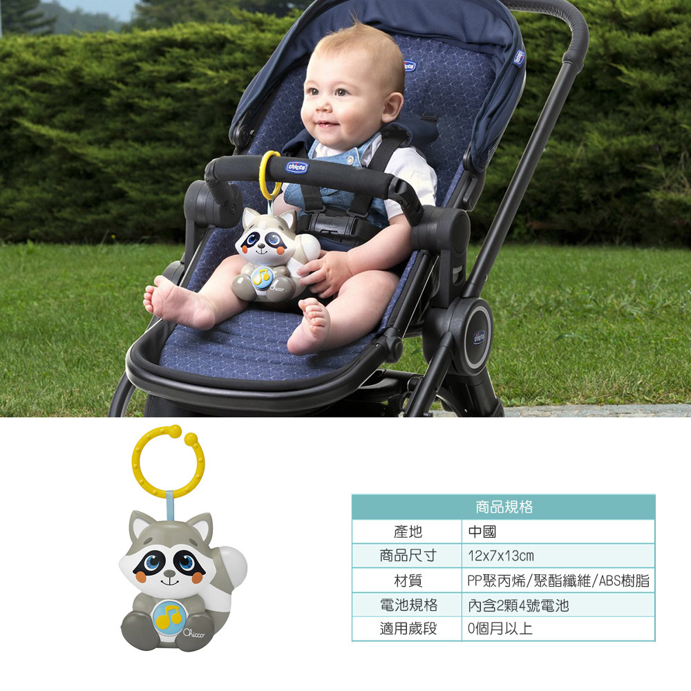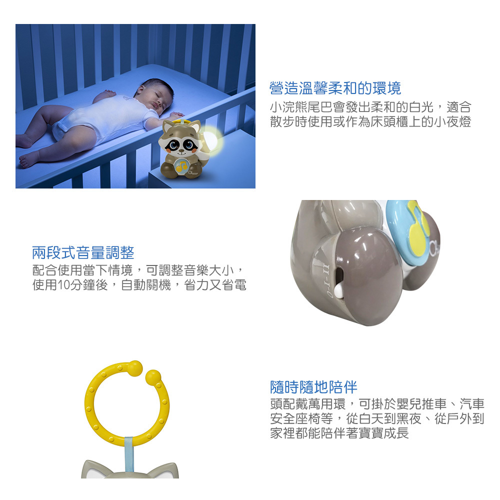 ●小浣熊頭頂配戴萬用環,適合掛於嬰兒推車、汽車安全座椅等