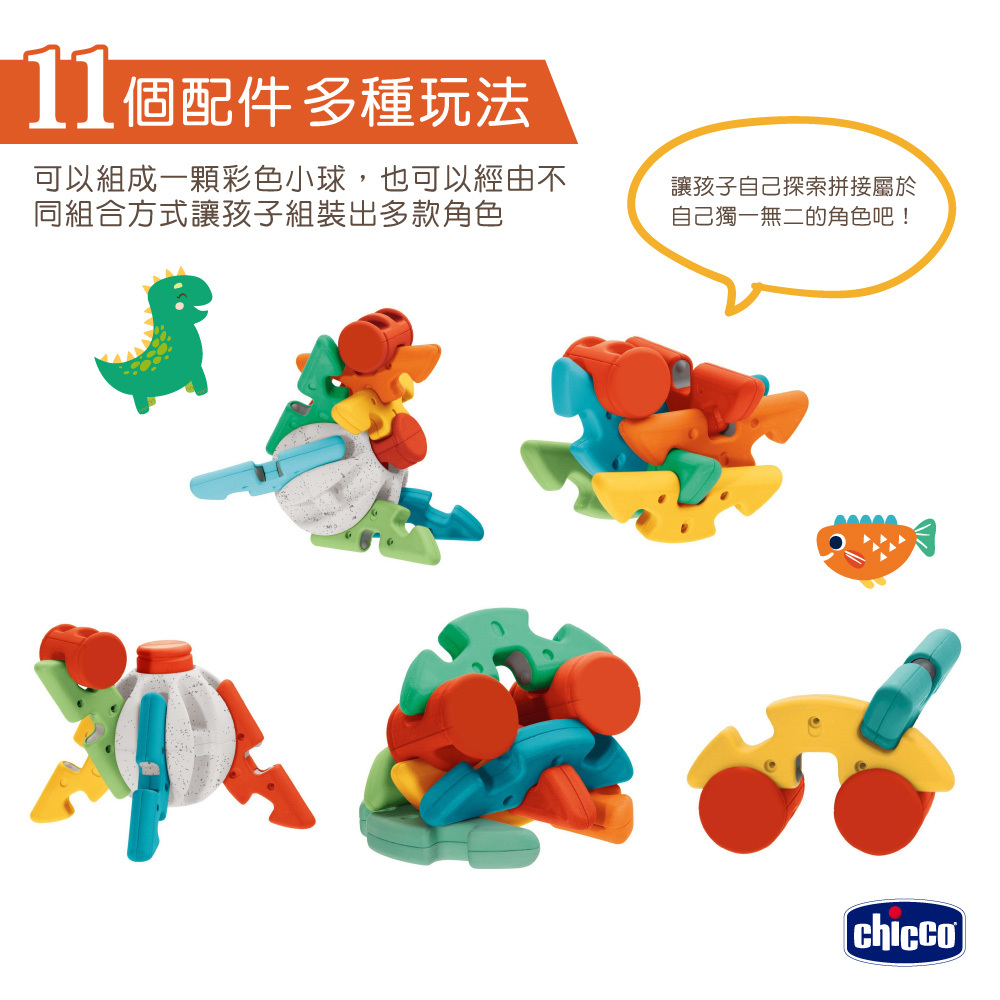 ●利用11個配件可以組成一顆彩色小球,也可以經由不同組合方式讓孩子組裝出多款角色