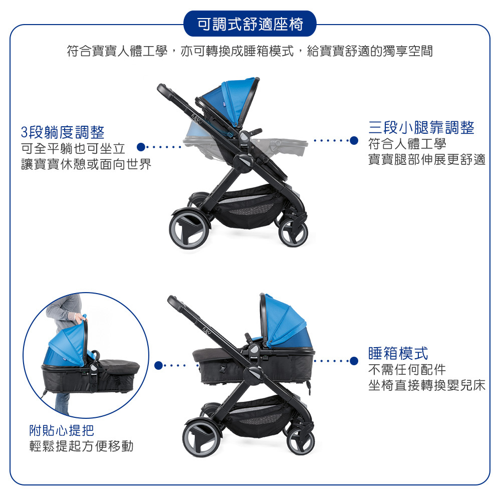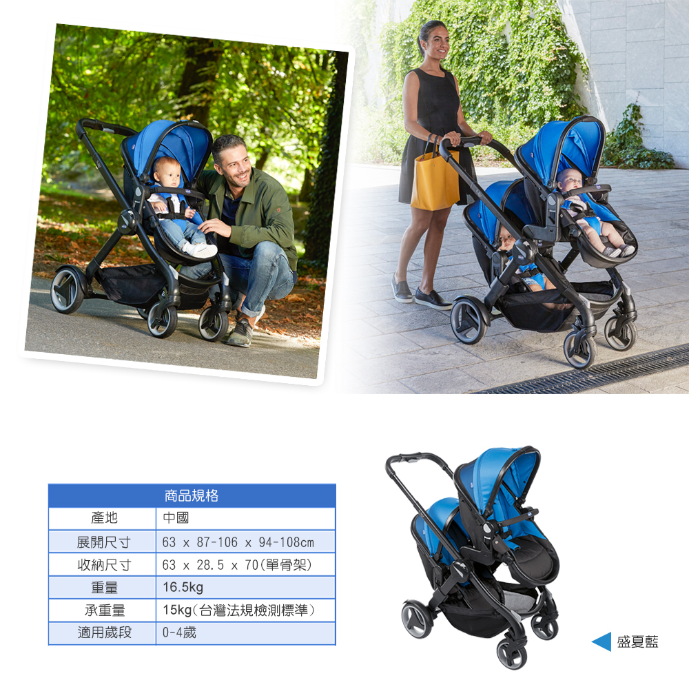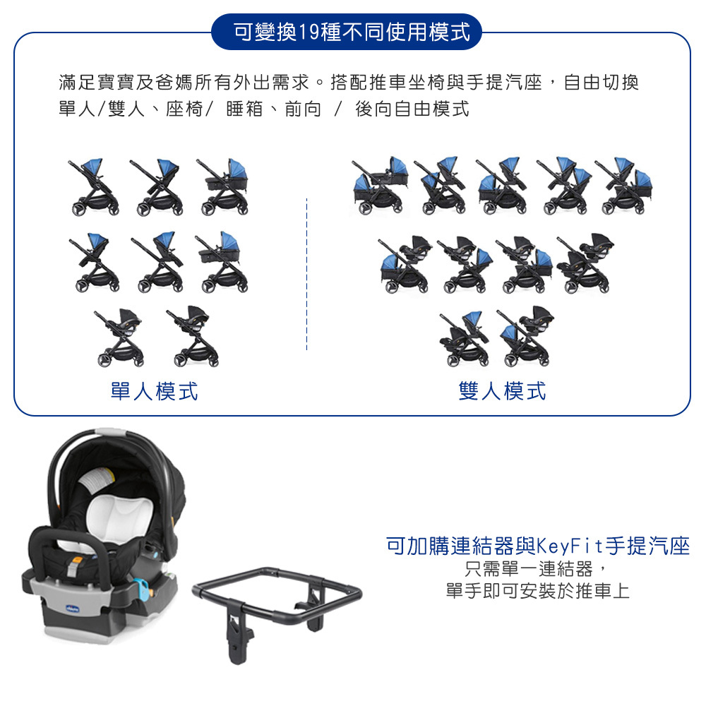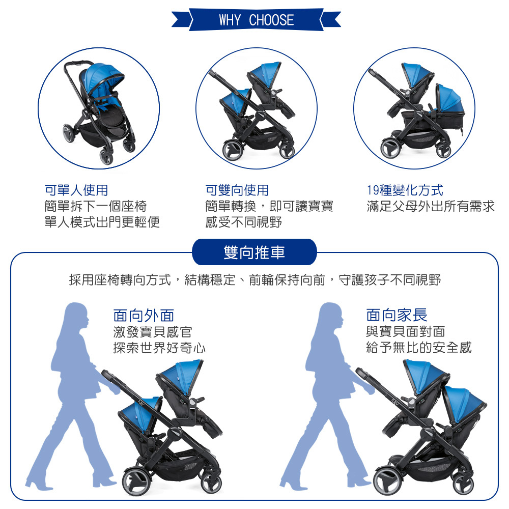 ●雙向推車,可變換19種模式,輕鬆變換雙人模式