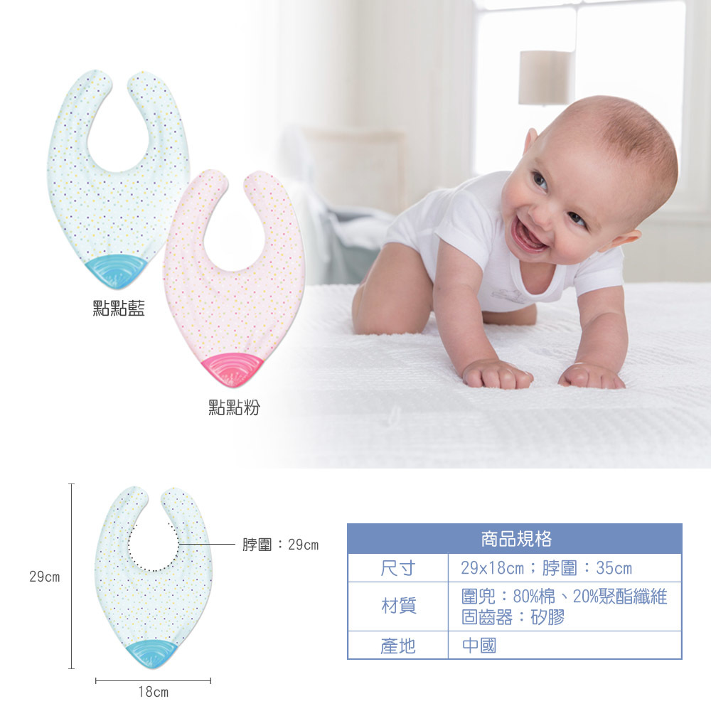 材質名稱:圍兜:80%棉、20%聚酯纖維;固齒器-矽膠