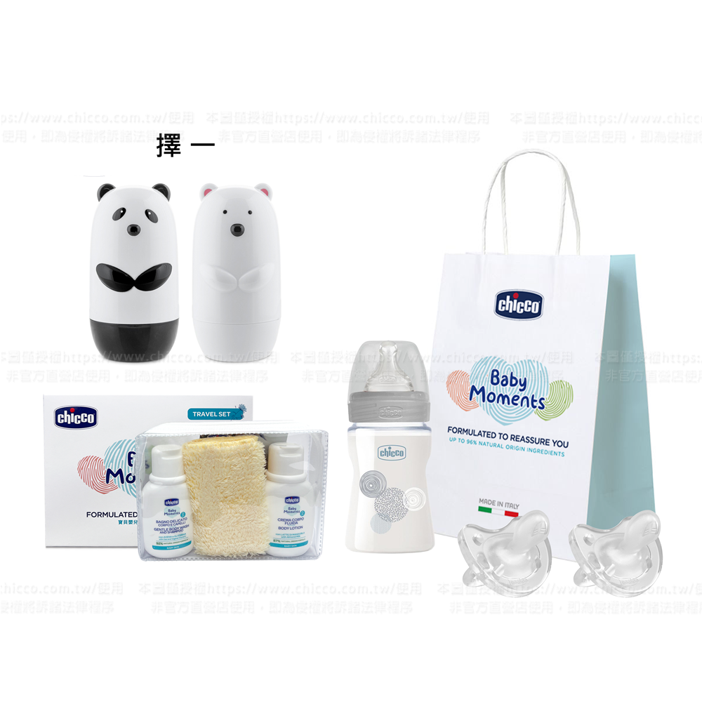 商品內容物:寶貝嬰兒植萃潤膚乳液200ml-1入、ECO+復刻風木頭小車-1入(顏色隨機)、舒適哺乳-防脹氣玻璃奶瓶 240ml(小單孔)-顏色隨機-1入、寶貝長牙舒緩清潔組-多功能凝膠及指套牙刷-1入、Chicco植萃紙袋(此內容不定期更換同等價值商品)