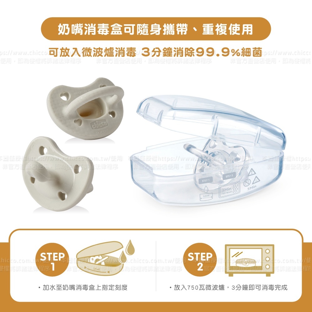 5.可放入消毒鍋,或加水至消毒盒後放入750瓦微波爐,只需3分鐘即可消除99.9%細菌,消毒盒可隨身攜帶並重複使用