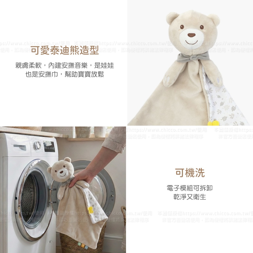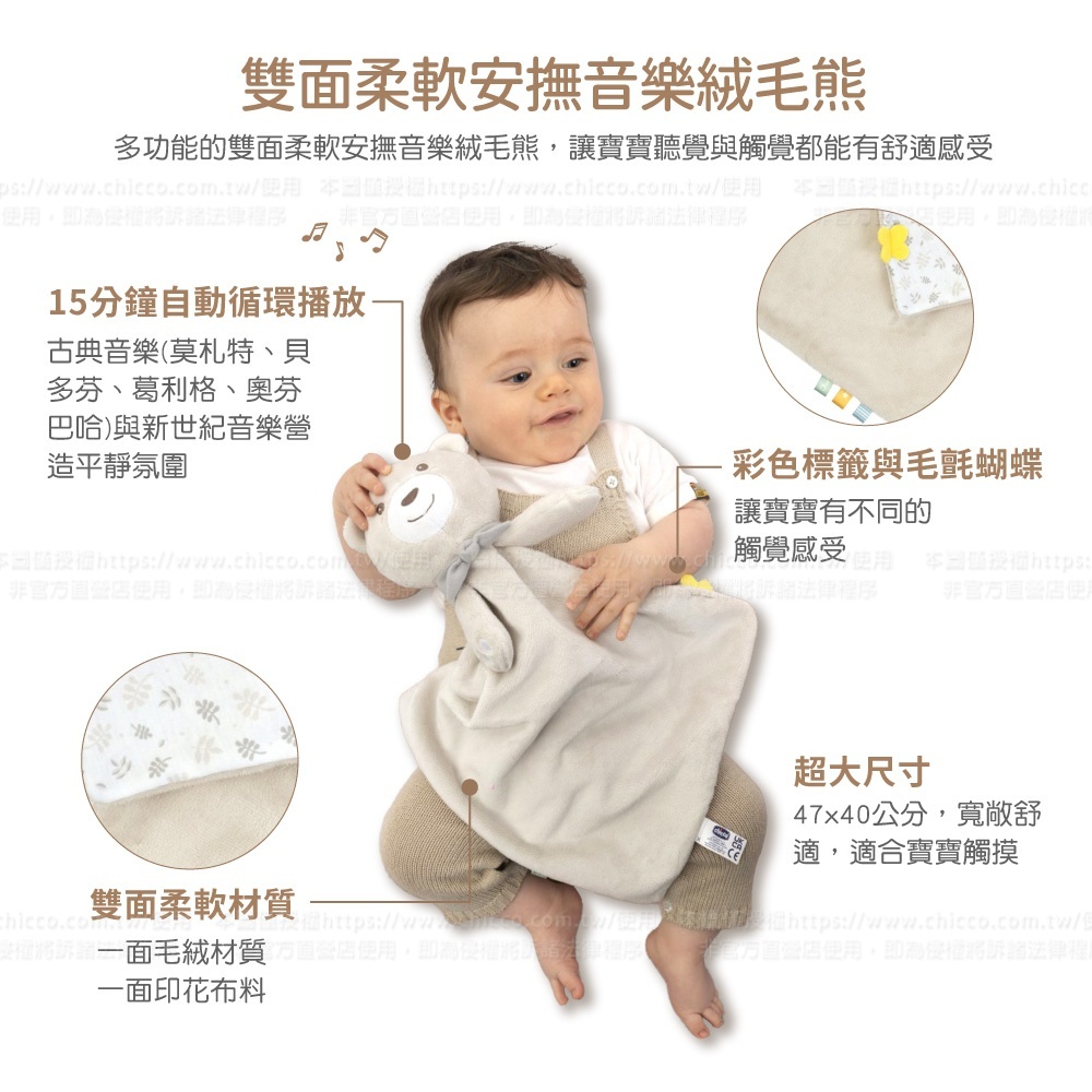 多功能的雙面柔軟安撫音樂絨毛熊,內建安撫音樂,是娃娃也是安撫巾,幫助寶寶放鬆,讓寶寶聽覺與觸覺都能有舒適感受。