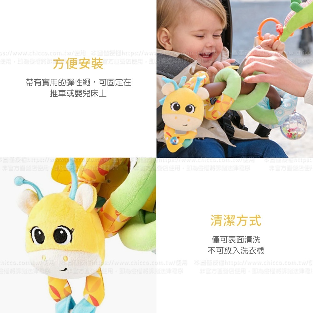 ●帶有實用的彈性繩,可固定在推車或嬰兒床上