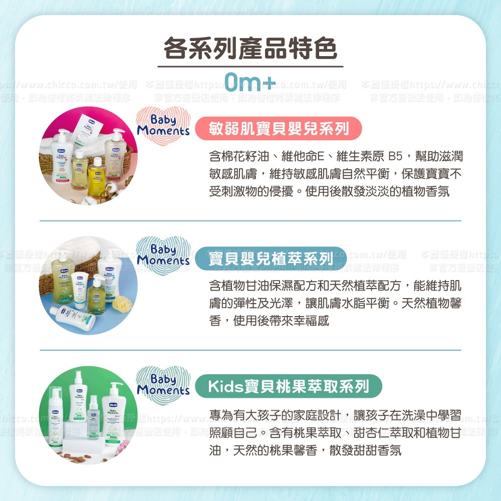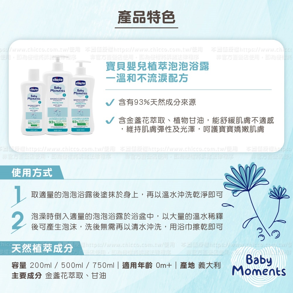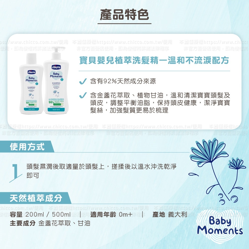 ●添加潤膚金盞花萃取,能舒緩肌膚不適感,富含植物甘油保濕配方,能維持肌膚彈性及光澤,呵護寶寶嬌嫩肌膚,天然的植物馨香,帶來使用後的幸福感受。溫和不刺激寶寶眼睛,讓寶寶快樂洗澎澎。