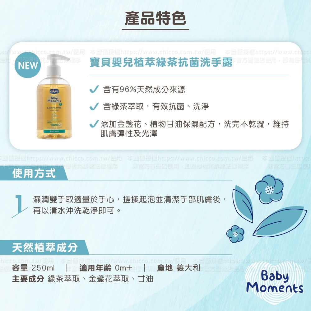 富含抗菌功效的綠茶萃取,添加金盞花、植物甘油,