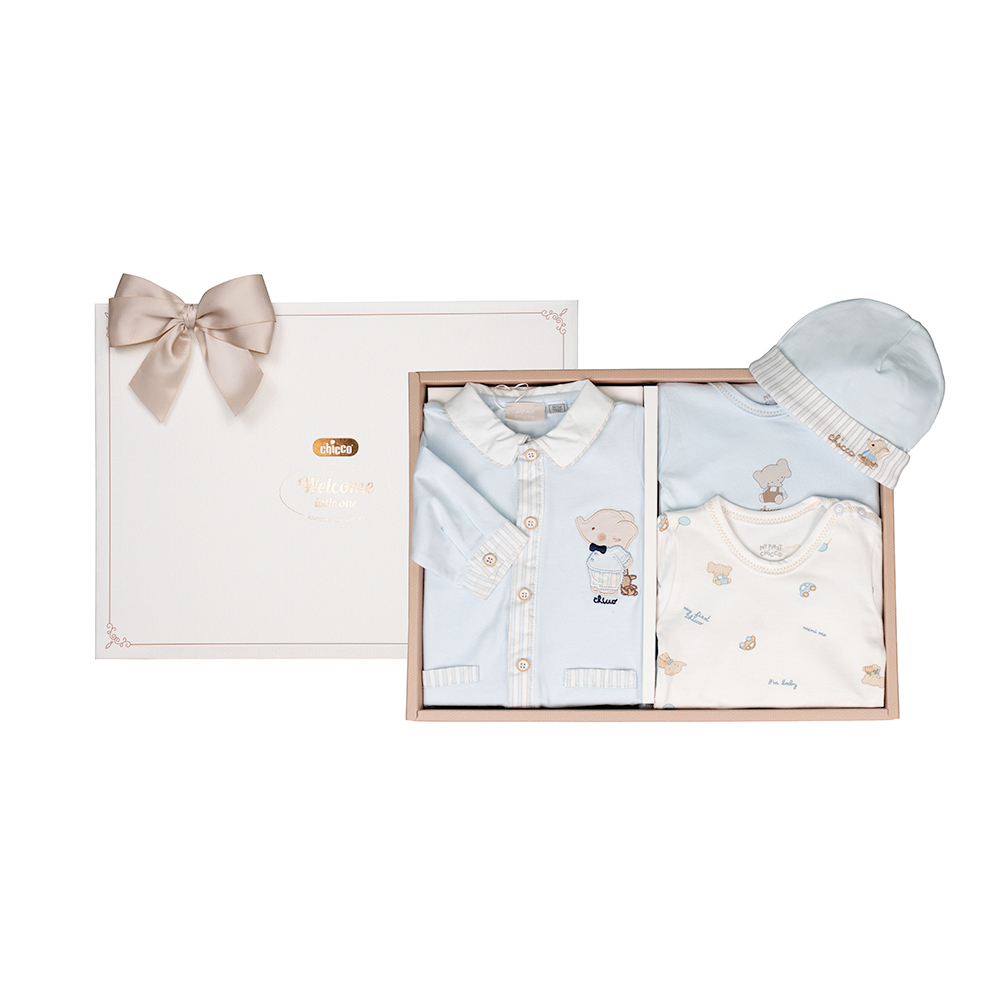 內容物:小象校園-有領繡圖前開長袖兔裝 62公分+ 小象校園-短袖連身衣二入 68公分+小象校園-直條反折嬰兒帽 尺寸40