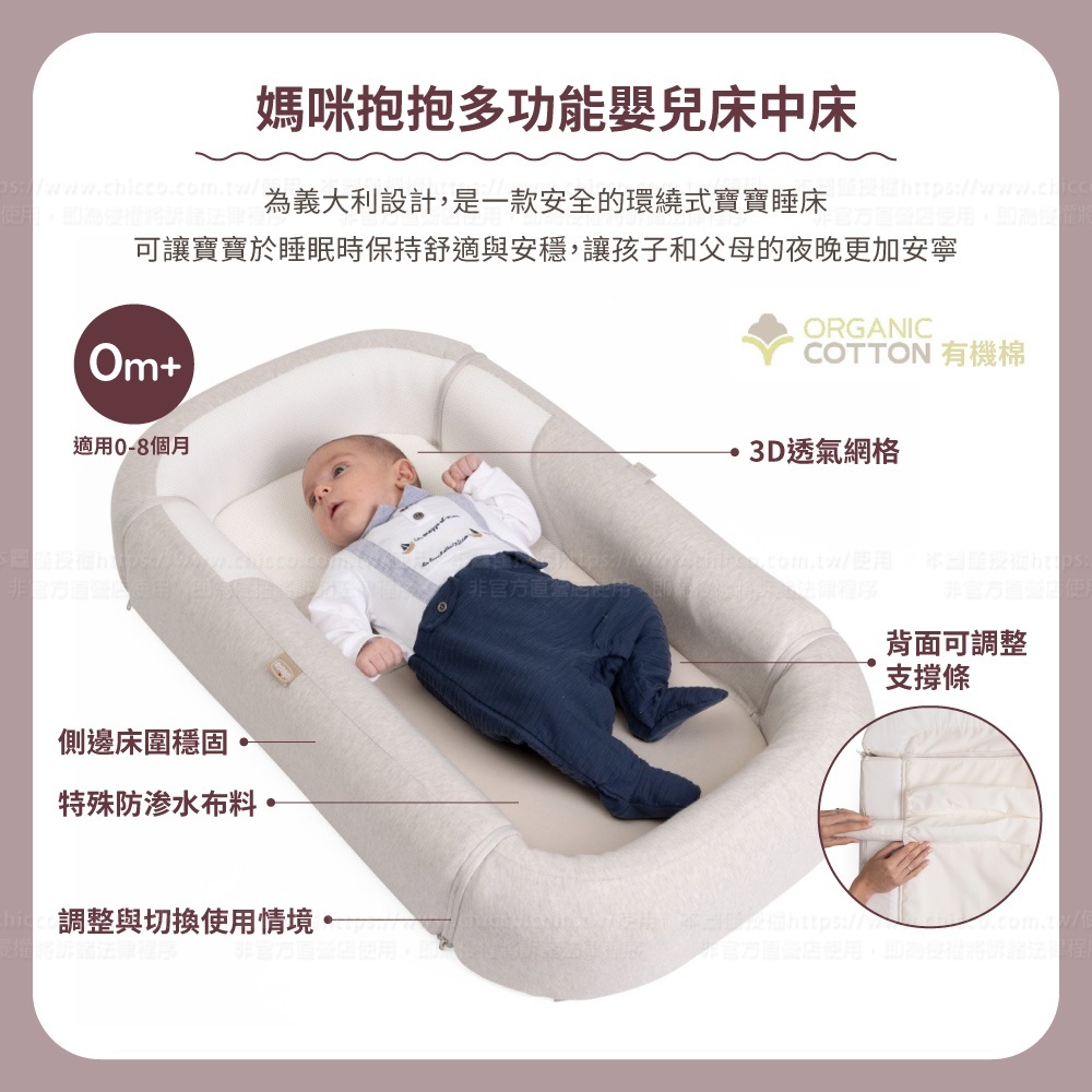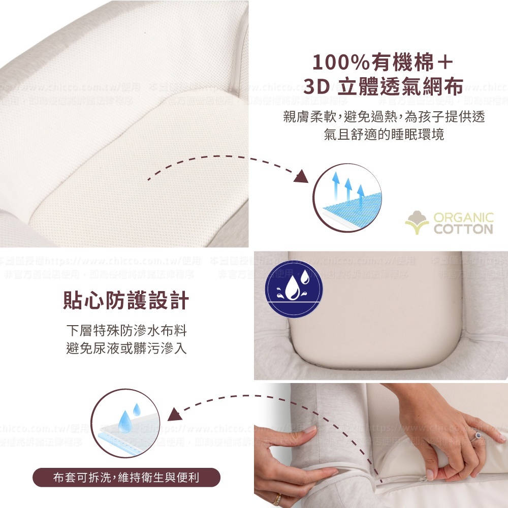 ●高品質差異化材質:100%有機棉+3D立體透氣網布,遠勝一般睡窩,符合新世代爸媽對材質的嚴格要求