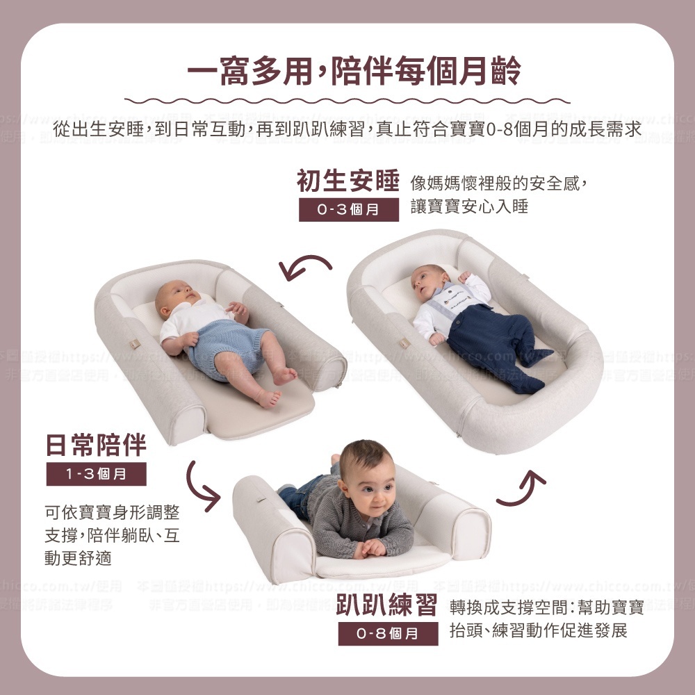 ●多功能用途:從新生兒安睡、日常陪伴,到趴趴練習,滿足寶寶不同時期的需求