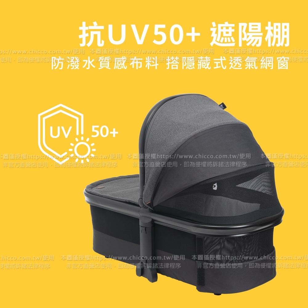 ●防潑水質感布料和紫外線防護抗UV50+遮陽篷,搭配隱藏式透氣網窗。