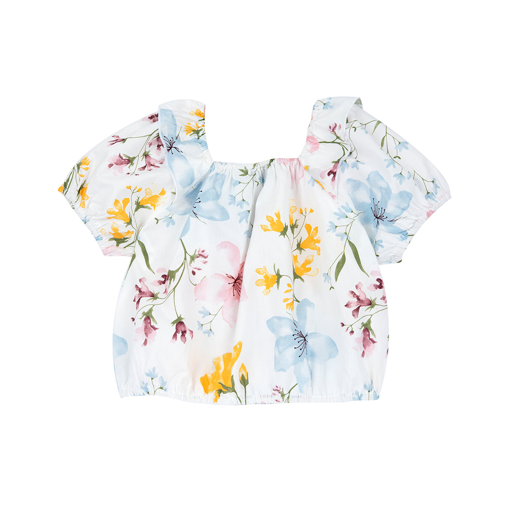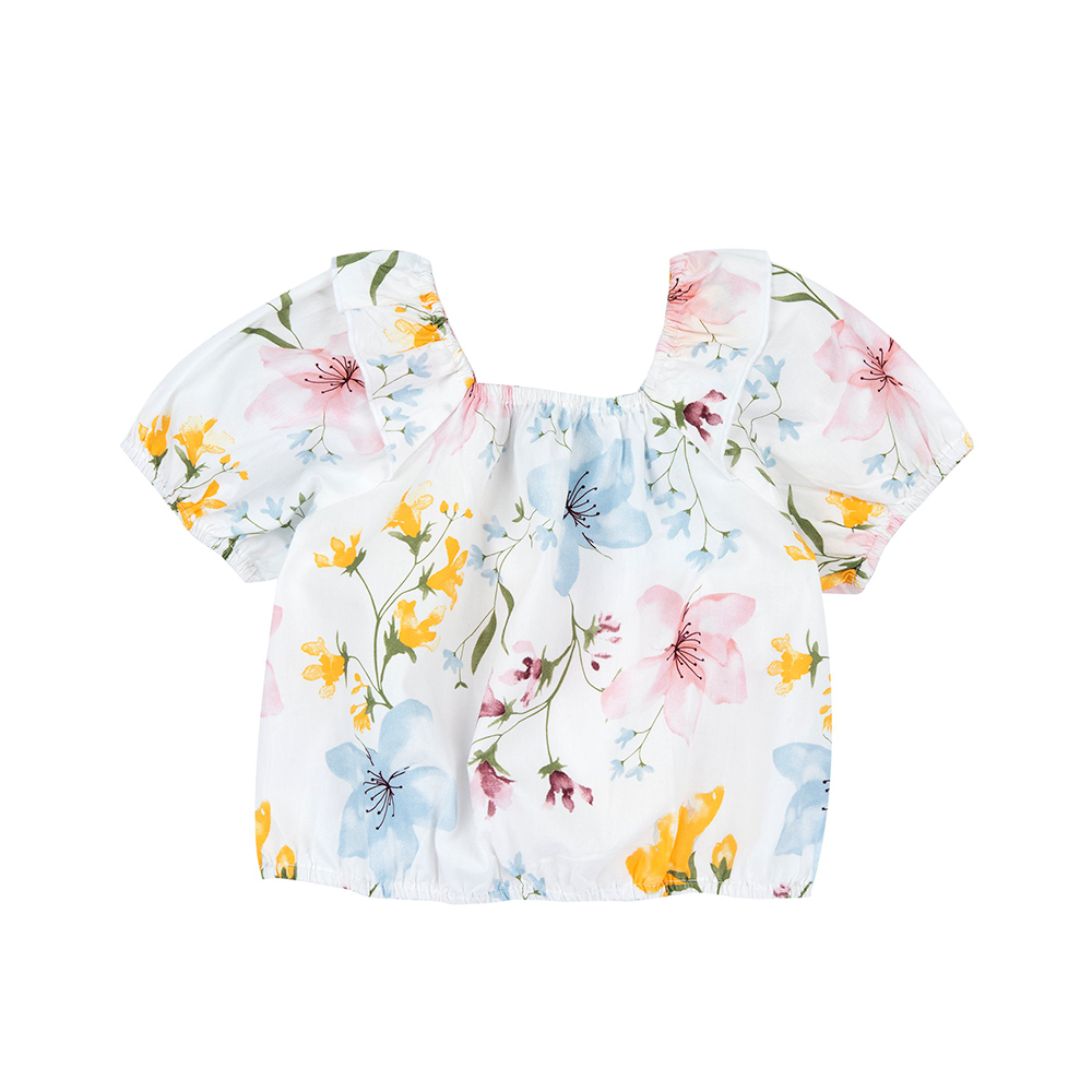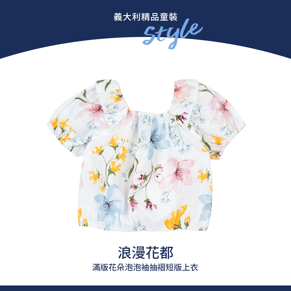 浪漫花都-滿版花朵泡泡袖抽褶短版上衣