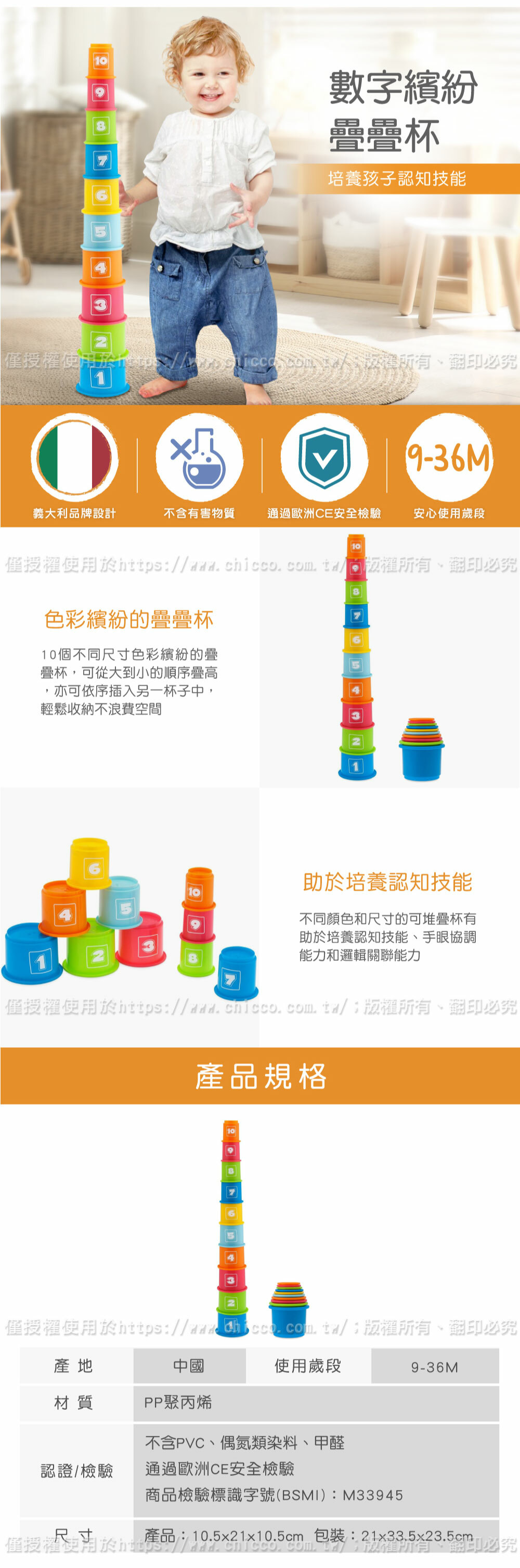 ●10 個不同尺寸色彩繽紛的疊疊杯,依照從大到小的順序堆疊